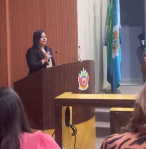 Lilyth Rezende durante lançamento de livro feito pela Abba, Pai.