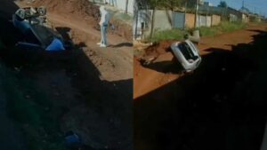 Câmera flagra carro com casal de idosos caindo em buraco de obra em Campo Grande