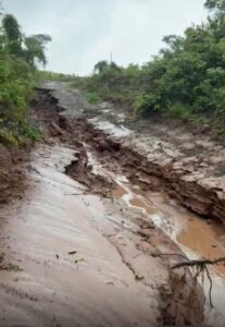 Nas imagens, é possível ver lama, barro e acúmulo de água no leito da estrada, além de trechos completamente levados pela chuva. A situação representa alto risco para carros, motos e caminhões, principalmente veículos pesados, como caminhões boiadeiros, que ficaram impedidos de atravessar o local.