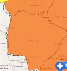 Alerta laranja indica perigo para todo o Mato Grosso do Sul, com previsão de chuva intensa, ventos fortes e possibilidade de granizo