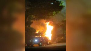 Uma Kombi pegou fogo e ficou completamente destruída na noite desta segunda-feira (13), na Rua 15 de Novembro, região central de Campo Grande.