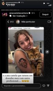 No desabafo, Giovanna falou sobre a importância do reconhecimento, especialmente quando se trata de alguém com a visibilidade de Ana Castela. “Saber que uma pessoa influente como você poderia ter feito essa tattoo diretamente comigo, e que até mesmo um simples story marcando meu perfil teria feito uma puta diferença pra mim, me deixa sinceramente chateada. A visibilidade que isso traria seria enorme para mim, e é algo que, pra quem vive da arte, importa muito!”